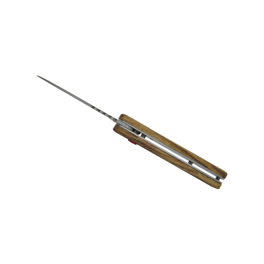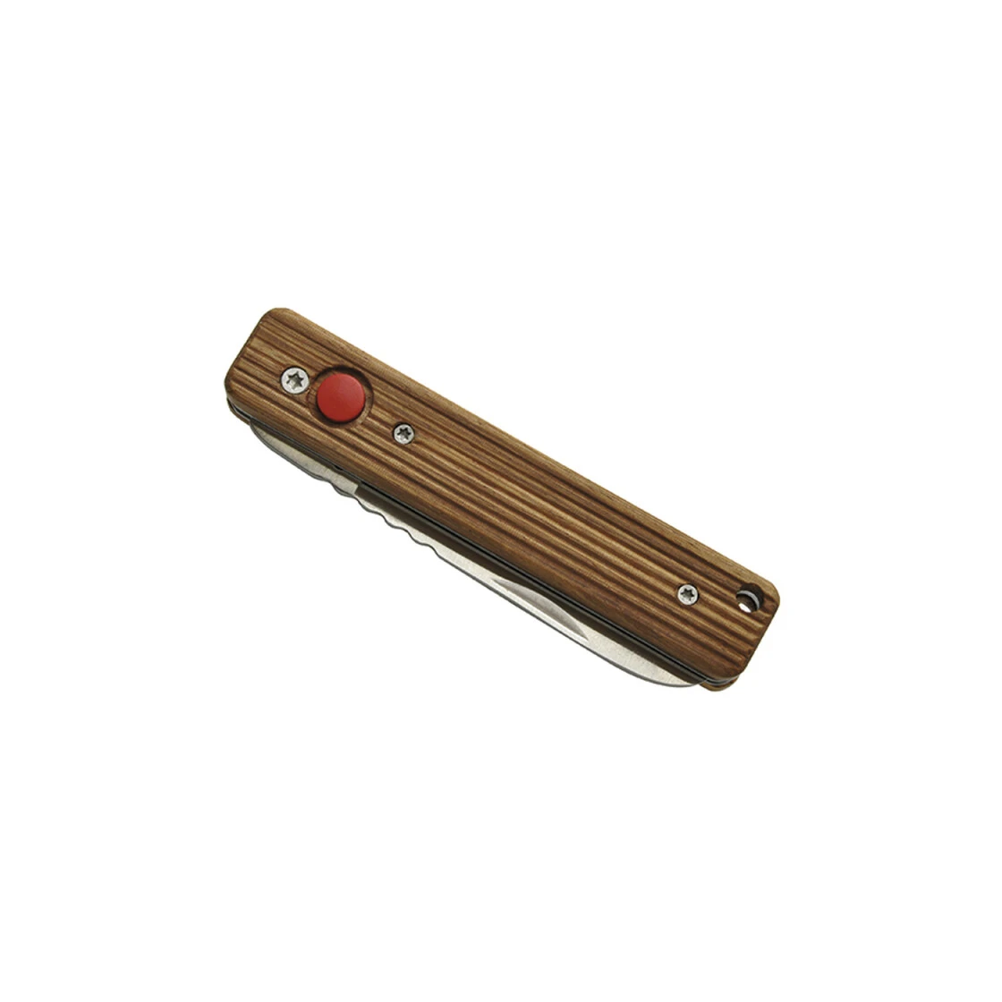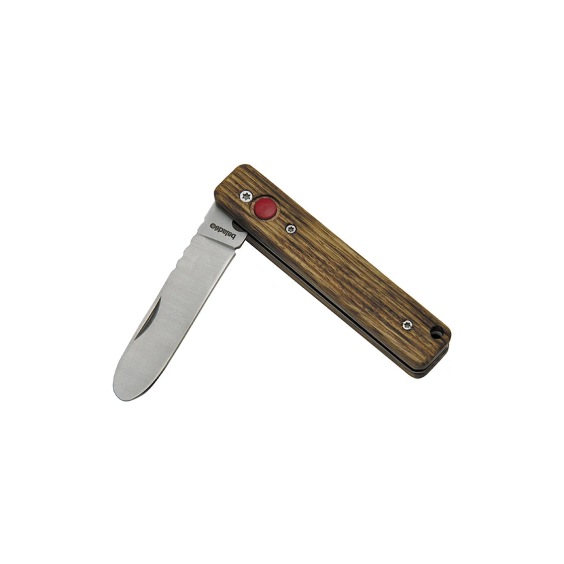 Das Kindertaschenmesser von baladéo. Die Klinge ist abgerundet und aus 420er Edelstahl gefertigt. Das Lösen und Feststellen der Klinge funktioniert nur über den eingelassenen Druckknopf. Ein versehentliches Drücken ist ausgeschlossen. Eine rote Kordel am Ende des Griffs aus Eschenholz rundet dieses Messer ab.