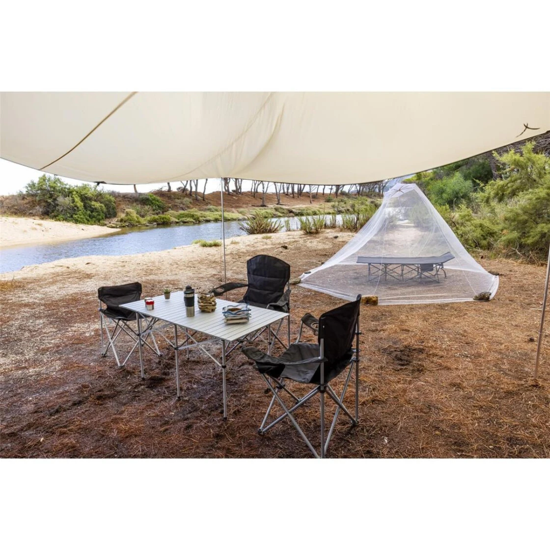 Baldachin aus weißem Moskitonetz. Komplett mit Aufhängehaken und Aufbewahrungsbeutel. Mit den Komfortmaßen von 2,5 Meter (Höhe) und ca. 11,5 Meter Umfang. Das Netz ist auf einer Seite offen, so dass man mit einem überlappenden Eingang bequem unter das Netz schlüpfen kann.