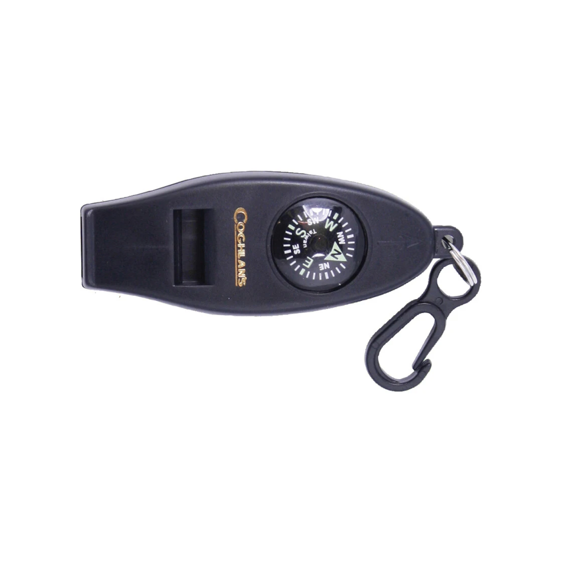 4-Funktionen-Pfeife: Kompass, Thermometer, Vergrößerungsglas und natürlich deutlich vernehmbare Signalpfeife in Einem. Mit Karabiner zum Befestigen.