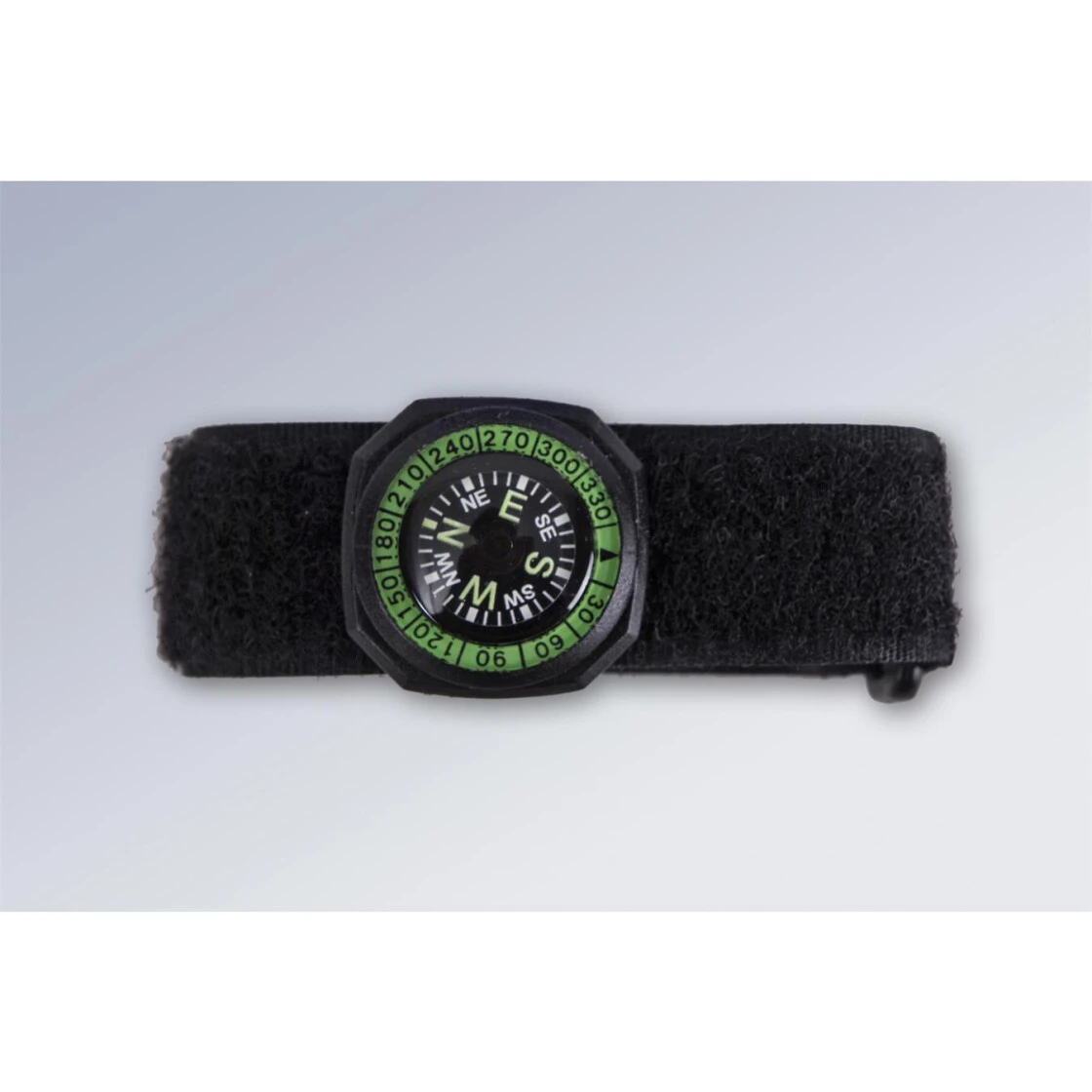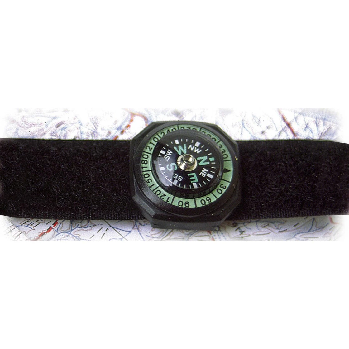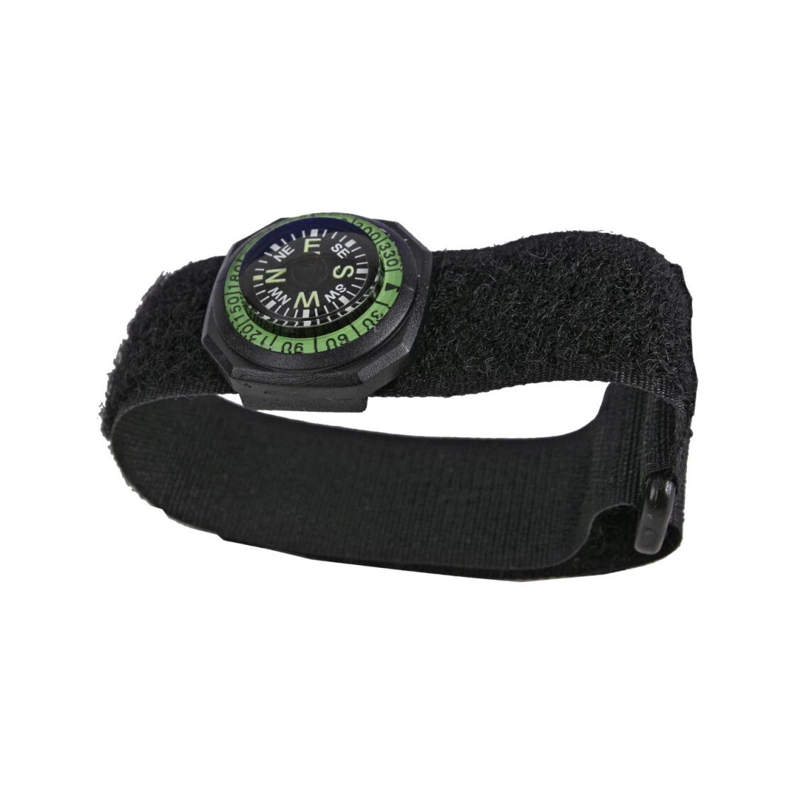 Flüssigkeitsgedämpfter Kompass mit nachtleuchtenden Ziffern, wasserdicht und stoßfest. Velcroband einstellbar. Auch mit vielen Uhrarmbändern tragbar.