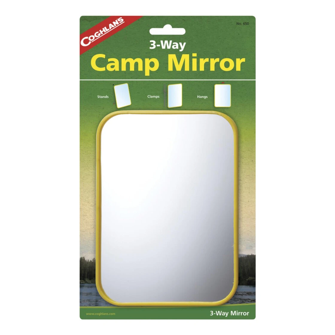 Qualitätsspiegel mit Kunststoffrahmen. Der rückseitig angebrachte Bügel erlaubt es, den Spiegel aufzuhängen, aufzustellen oder an einer Stange (z. B. im Zelt) anzuklemmen.