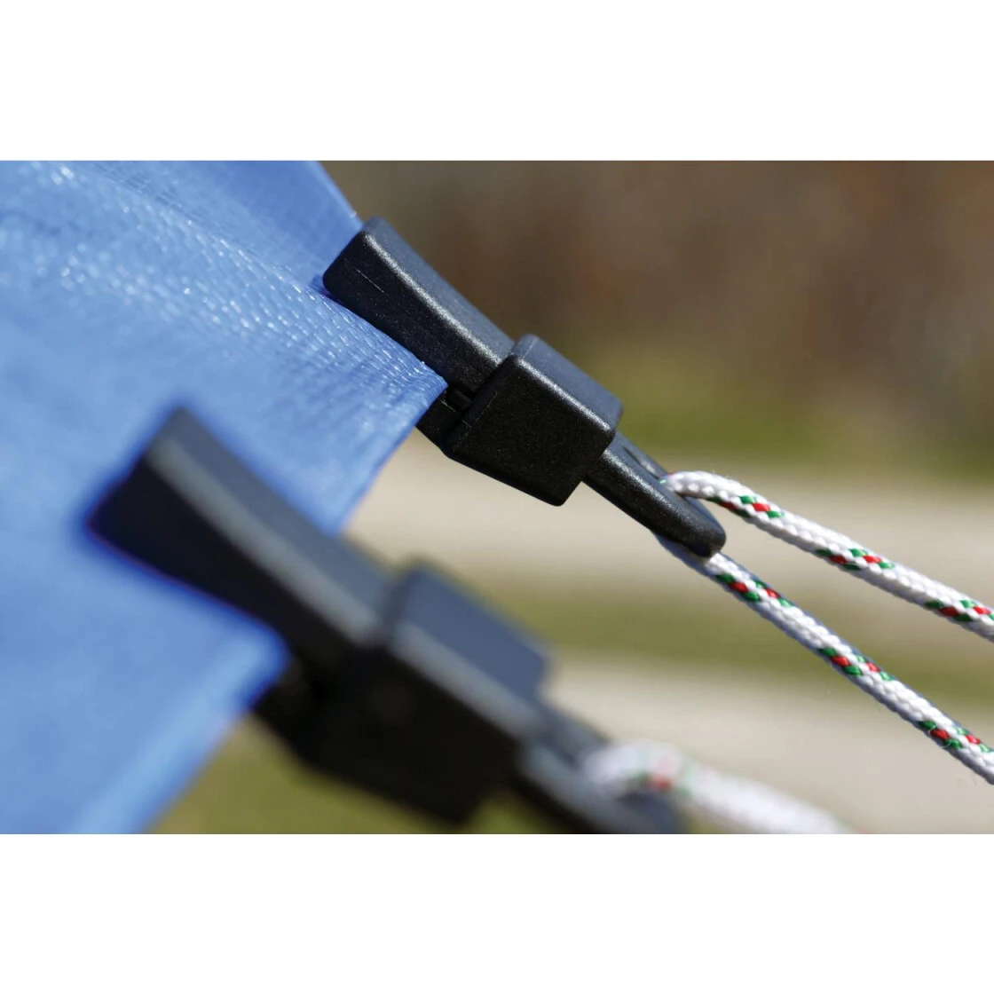 Einfache und schnelle Möglichkeit, Tarps, Planen, Unterlegplanen und ähnliches zu fixieren. Einfach anklemmen. Bei ausreichender Materialstärke und angemessenem Zug hinterlassen die Clips keine Materialschäden.