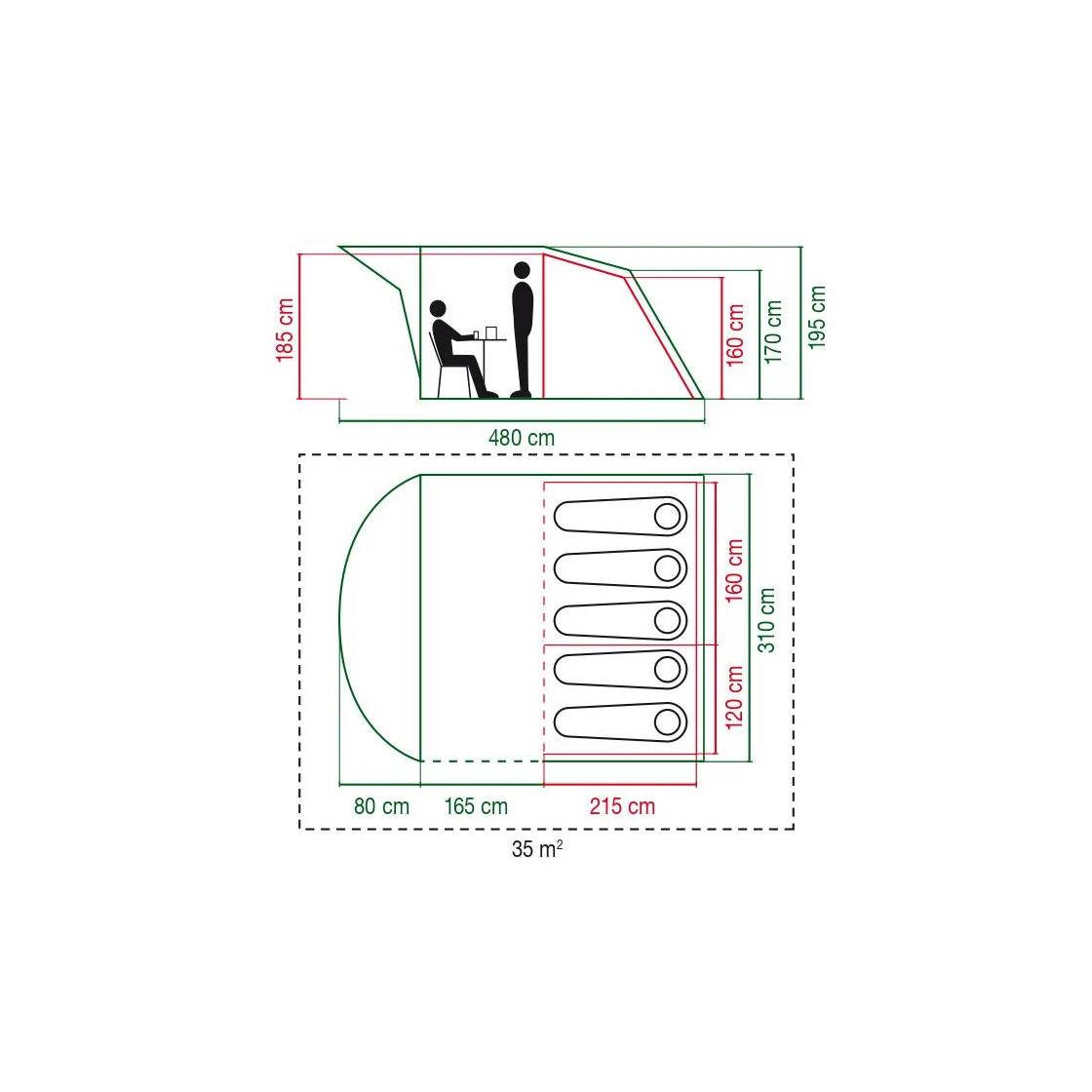 Ein Familien- oder Gruppenzelt in Tunnelbauweise mit schönem Vorraum. Die Schlafkabine ist komplett schwarz gehalten (BlackOut Bedroom) und ermöglicht erholsamen Schlaf zu jeder Zeit. Ein kleines Vordach schützt den Eingang vor Regen. Mit der sehr guten Wassersäule von 4.500 mm und den vormontierten, reflektierenden Spannschnüren sowie der flachen Bodenplane ist das Zelt sicher ausgestattet und gegen viele Unbillen gewappnet.