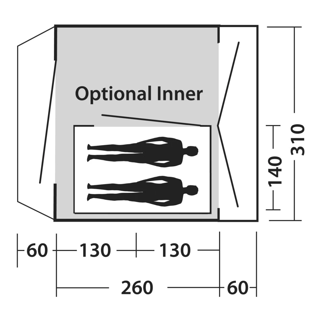 Ein freistehendes Vorzelt in Tunnelbauweise für Wohnmobile, MPV und Busse. Wird mit zwei vorgebogenen Gestängebögen aufgebaut und durch zwei Stahlstangen im Inneren stabilisiert. Das Zelt hat wegen der großen Fensterflächen eine gute Aussicht zu bieten und ist hell und geräumig. Die Fenster sind mit Vorhängen ausgestattet. Der Boden ist wannenförmig hochgezogen um Schutz vor Feuchtigkeit und Insekten zu bieten. An der Rückseite ist eine Doggingzone, welche ein bequemes Rangieren des Autos an das Zelt ermöglicht. Das Verbindungsteil zwischen Auto und Zelt wird dann einfach über das Auto gezogen und befestigt.