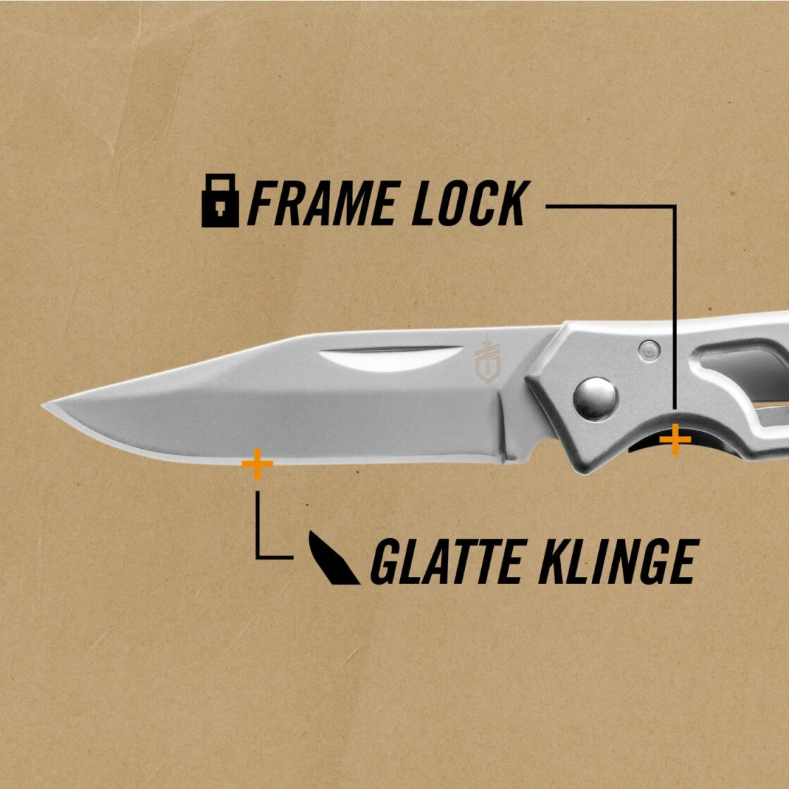 Dieses leichte, alltagstaugliche Messer hat eine offene Rahmenbauweise für ein ultimativ minimalistisches Design. Das Messer mit glatter Klinge aus rostfreiem Edelstahl besitzt eine Frame Lock-Verriegelung der Klinge für höchste Sicherheit im geöffneten Zustand. Ganz aus Edelstahl ist es leicht zu reinigen, zu tragen und zu öffnen und lässt sich mühelos in Ihrer Tasche oder an Ihrer Hose per Taschenclip befestigen.