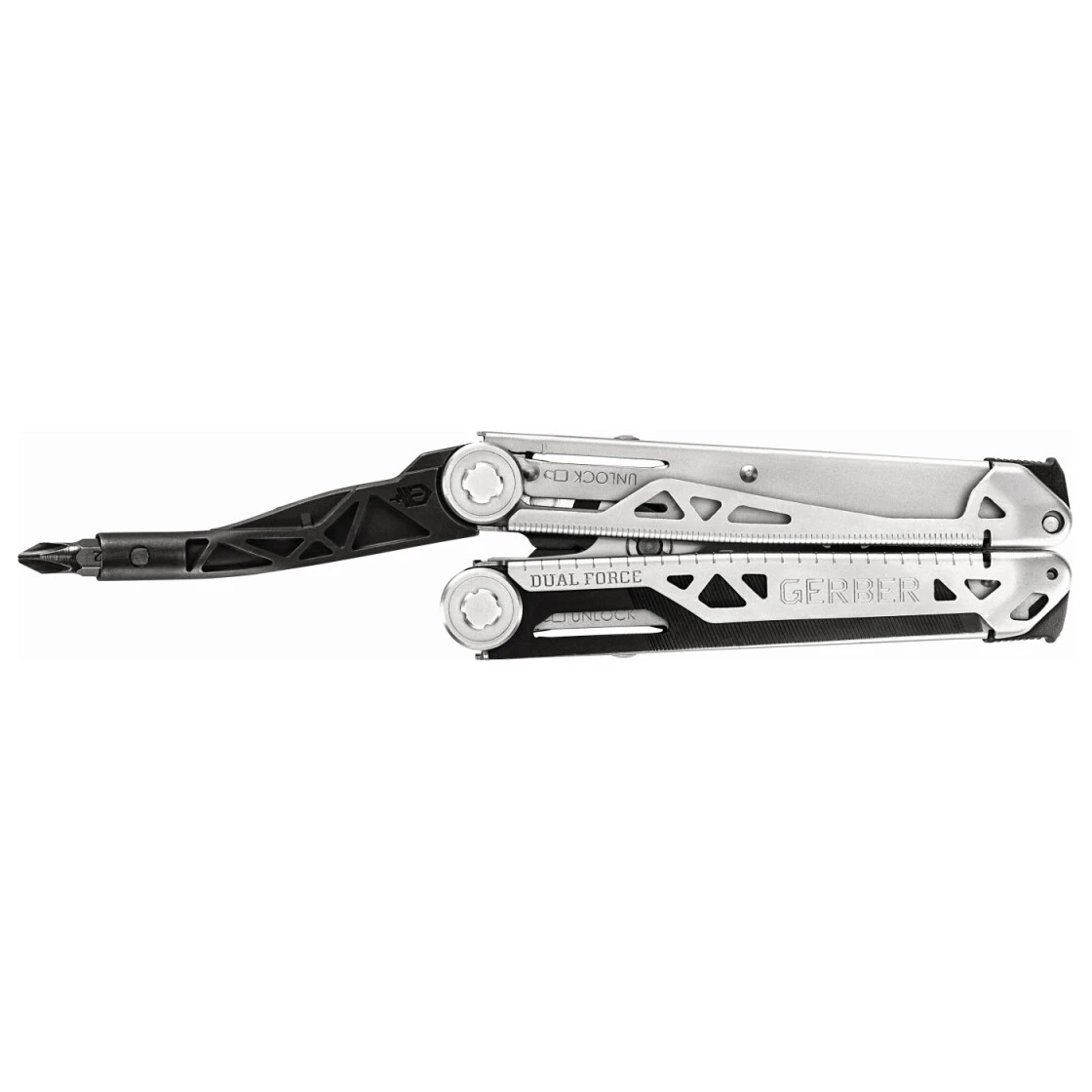 Das Multi-Tool Dual Force ist kein gewöhnliches Multifunktionswerkzeug. Seine mehrlagige Konstruktion bietet 2-mal höhere Backenstärke und 2-mal mehr Kraft für jede Aufgabe. Die Zange mit 2-fach verstellbarem Gleitgelenk und extragroßen Zähnen bietet kräftigen Halt auf einer Vielzahl von Befestigungen und dabei unübertroffene Kontrolle. Zusätzlich ist der Bit-Schraubendreher mit zentrierter Achse ideal, um wirklich damit zu arbeiten: zentriert, mit langem Hebel und für Standard-Bits ausgelegt. Die außenliegenden Werkzeuge wie zum Beispiel das Messer arretieren per Frame Lock für sicheres Arbeiten. Zum Lieferumfang gehört ein Gürteletui.