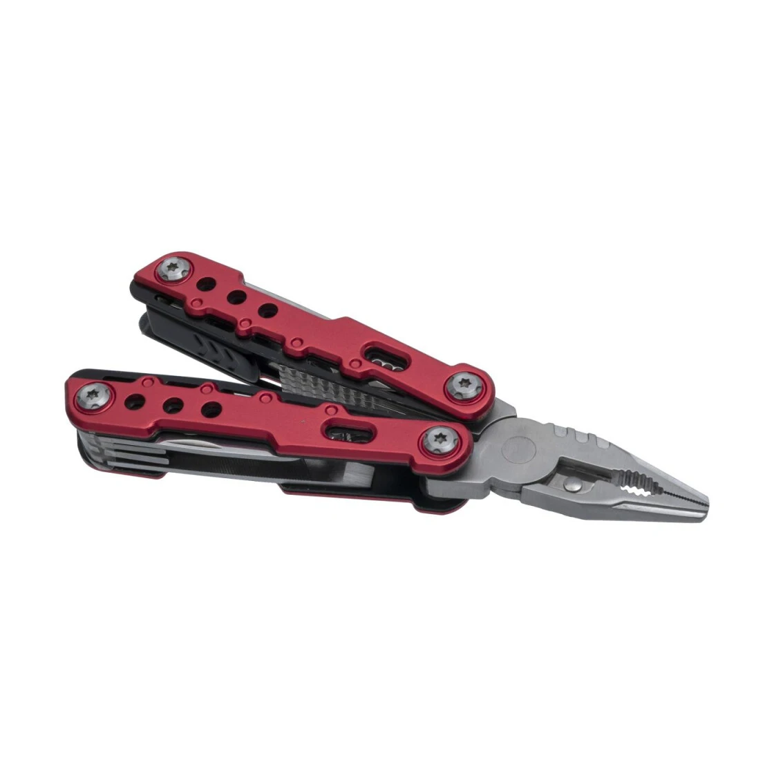 Gefertigt aus speziell gehärtetem Messerstahl genügen die Werkzeuge dieses Multitools höchsten Ansprüchen. Die aus Aluminium hergestellten Griffschalen sind verschraubt und fassen das ausgereifte Sicherheitsschloss ein welches jedes Werkzeug sicher verriegelt. Dieses vermindert das Verletzungsrisiko erheblich und die Werkzeuge rasten sauber ein. Die Klinge des Seitenschneiders ist separat eingesetzt und kann bei Bedarf nachgeschliffen werden. Dieses Tool ist der unentbehrliche Begleiter für Unterwegs, Camping und Outdoor.
