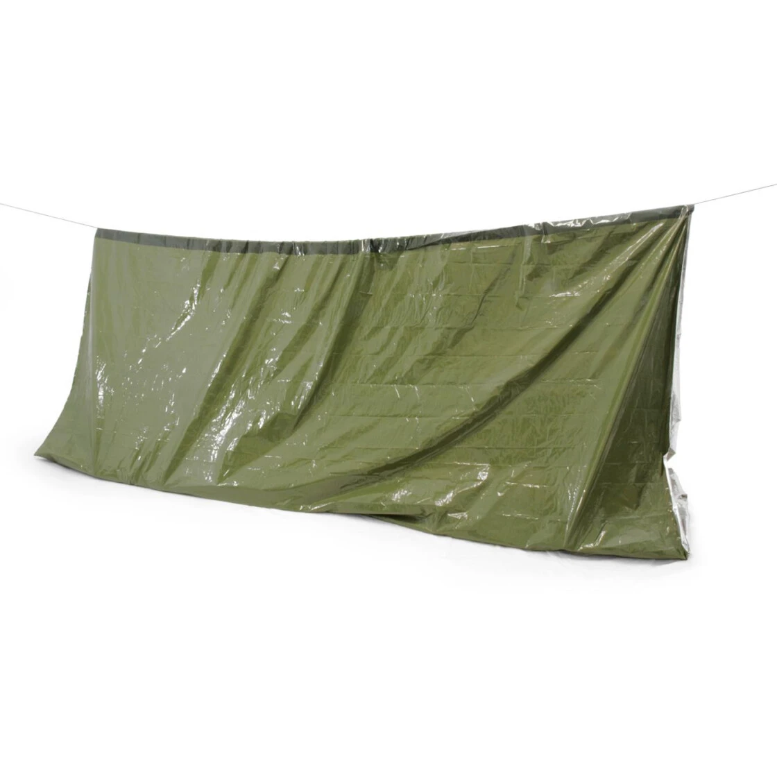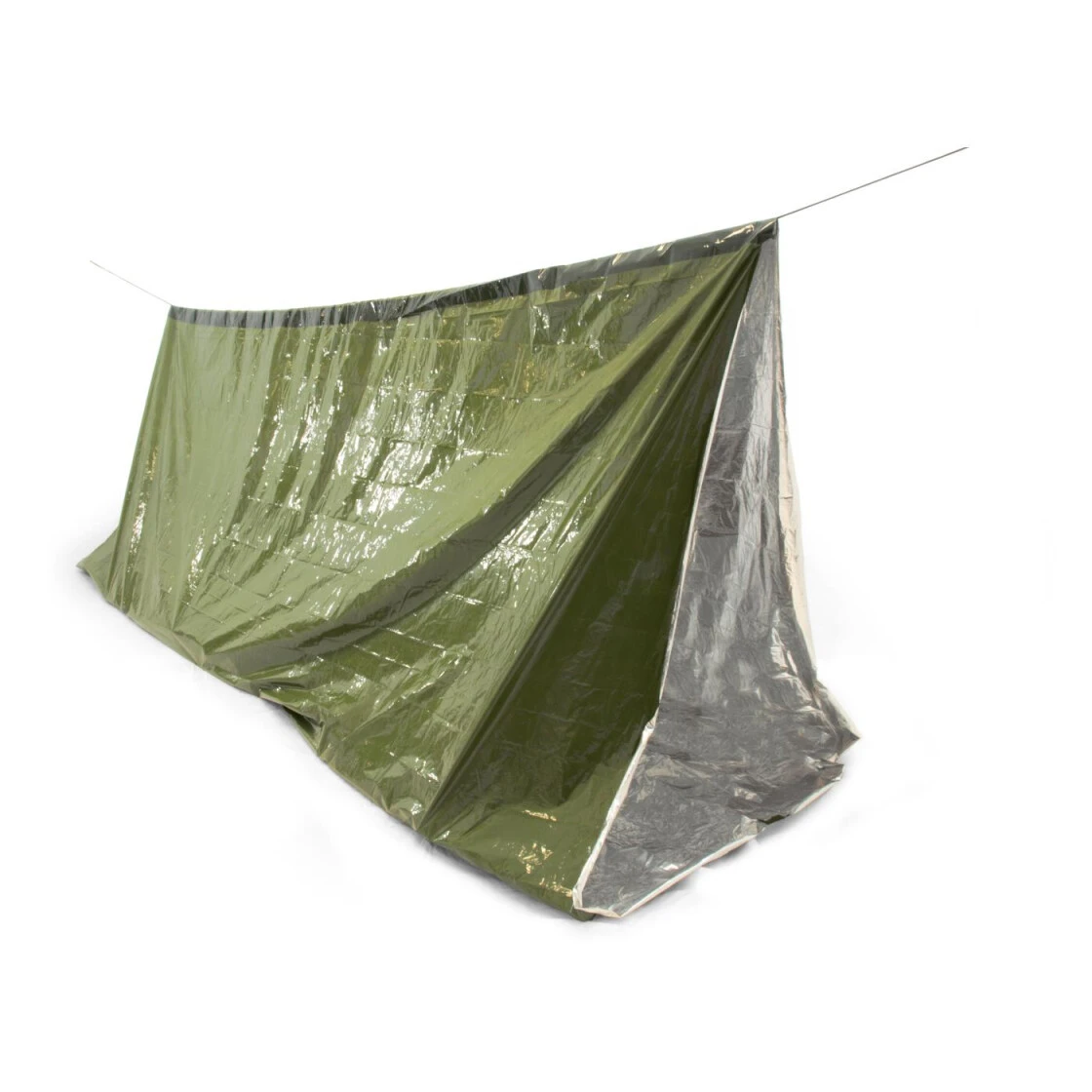 Das Survivalzelt ist speziell für Trekking, Bushcrafting und Notfallsituationen gemacht. Ob beim Wandern, Campen oder Trekking, das Zelt schützt dank seiner inneren reflektierenden Oberfläche vor Unterkühlung und dem Erfrieren. Das Design des Zeltes trotzt extremsten Wetterbedingungen wie Wind, Regen Sturm oder Kälte. Dank seiner Länge von weit über zwei Metern passen Personen jeglicher Körpergröße hinein. Mit dem 6 m langen Paracord kann das Zelt sehr gut abgespannt werden. Mit den eingearbeiteten Metallösen kann das Zelt mit den im Lieferumfang enthaltenen Heringen am Boden fixiert werden. Ferner kann das Zelt auch als Bivy oder Tarp verwendet werden. Es ist leicht und platzsparend verstaubar. Ein Packsack ist ebenfalls im Lieferumfang enthalten.