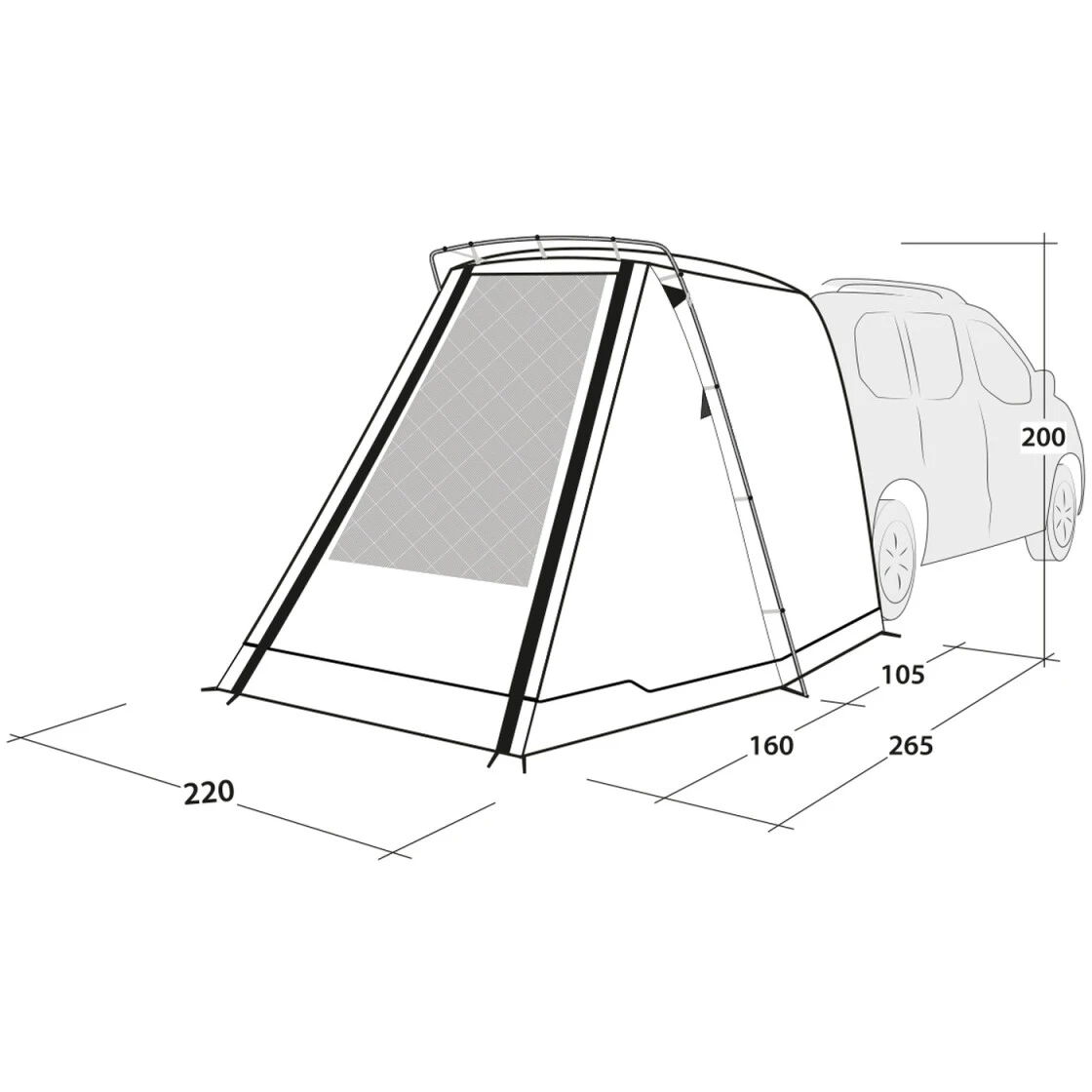 Das Sandcrest S ist ein Heckzelt für Minivans mit einer Höhe von 155-185cm. Es ist für Fahrzeuge und Minicamper wie dem VW Caddy, Peugeot Rifter, Citroen Berlingo und dergleichen konzipiert und ist perfekt für Kurztrips und bietet Platz zum Kochen, als Tagesunterkunft oder Umkleideraum. Dank des intelligenten Designs können Sie die Heckklappe sicher schließen und verriegeln, wenn Sie zu einer Wanderung oder zum Essen gehen, oder sie lassen die Heckklappe nachts geöffnet, während Sie Ihr Van-Heck mit dem internen Insektenschutzgitter für eine gute Belüftung sichern. Mit nur einem Aluminium-Bogen ist es sehr schnell aufgebaut und es hat ein sehr geringes Packmaß. Durch das clevere Befestigungssystem werden Fahrzeugtüren nicht durch Abspannseile blockiert. In der Zelttür ist ein großes Insektenschutzfenster, welches mit einem wasserdichten Vorhang verschlossen werden kann. Die Tür kann mit optionalem Gestänge als zusätzliches Sonnensegel ausgespannt werden.
