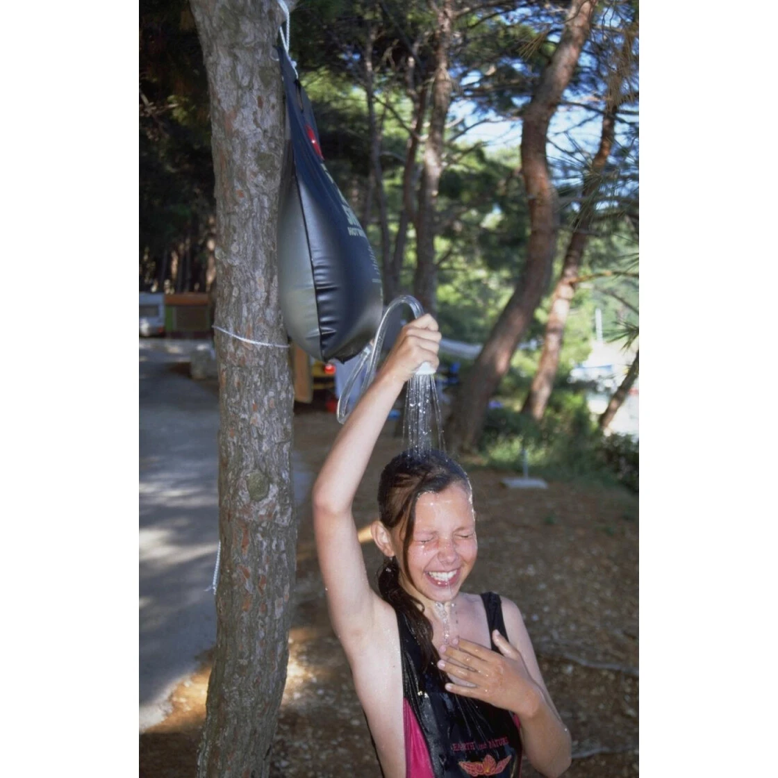 Erwärmt das Wasser mit Sonnenergie in ca. drei Stunden auf über 30 °C. Ein Seil mit Haken ermöglicht die Anbringung an Bäumen oder anderen Befestigungsmöglichkeiten. Ein Ventil am Duschkopf kontrolliert die Dosierung des Wasserstrahls. Die Dusche ist rollbar und somit platzsparend zu transportieren. Ideal für die schnelle Dusche bei Camping, Picknick, am Meer oder im Garten.