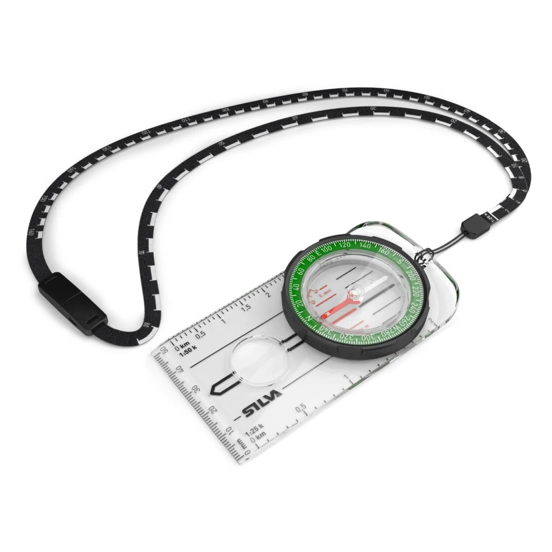 Klassischer Linealkompass mit der griffigen Dryflex Dose und einer integrierten Lupe. Die Skala zur Deklinationskompensation befindet sich auch hier innerhalb der Kapsel. Mit fluoreszierenden Elementen, Milimeterskala und abnehmbarem Sicherungsband.