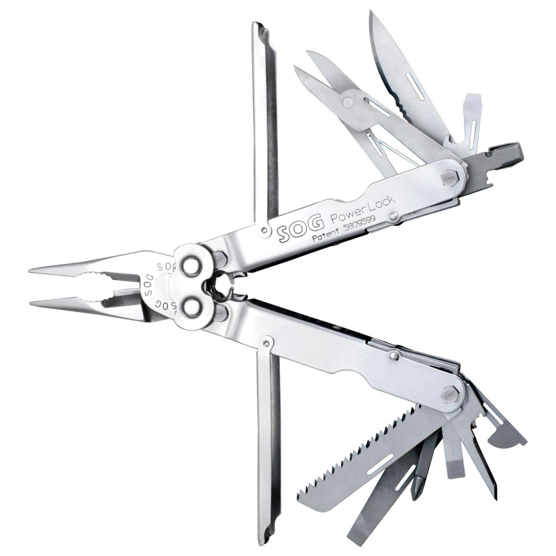 SOG, einer der großen amerikanischen Hersteller von Multifunktionswerkzeugen, hat hier mit dem patentierten Compound-Leverage-System den verwendeten Kraftaufwand, z. B. zum Schneiden von Kabeldraht, automatisch verdoppelt. Dieses Tool wurde so konstruiert, dass ein Öffnen mit einer Hand, ein wenig Übung vorausgesetzt, problemlos und ohne Einschränkungen der Stabilität möglich ist. Alle Teile sind leicht zugänglich und werden im geschlossenen Zustand von einer speziellen Abdeckung geschützt. Die abgerundeten Abdeckungen dienen gleichzeitig als Komfortgriff. Die versetzte, doppelreihige Verzahnung der Säge und die spezielle Konstruktion der Feile z. B. sind Garanten für schnelles und sicheres Arbeiten.