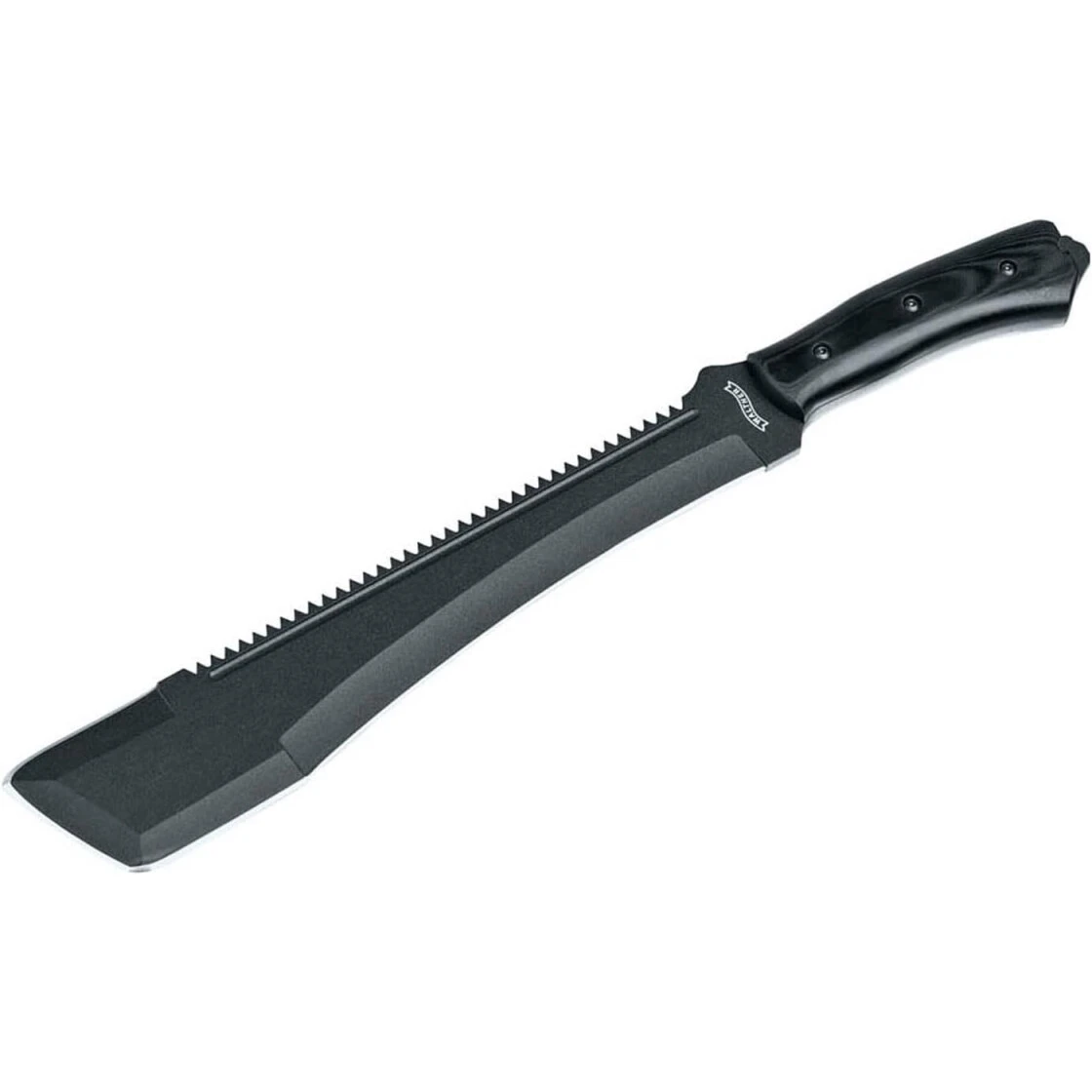 Das Herzstück der MSM Machete (Modified Survival Machete) ist die universelle Klinge, deren pulverbeschichteter, schlagzäher Karbonstahl 1065 per Vollerl im Griff weitergeführt wird. Unterteilt in Bereiche meistert sie an jeder Stelle eine Vielzahl von anspruchsvollen Aufgaben. Die vorderlastige Bauweise verteilt das Gewicht der Machete zur Klingenspitze, wodurch sich erstklassige Hau- und Hackeigenschaften entwickeln. Dort ist auch die Sekundärschneide zu finden, die unterschiedlichste Arbeiten wie Graben und Hebeln ermöglicht. Ein scharf gezahnter Sägerücken deckt die Arbeit mit faserigem Material ab. Die ergonomisch geformte G10-Beschalung des Griffs garantiert sicheres Arbeiten. Dort befindet sich auch das praktische Schlagstück und die Fangriemenöse. Lieferung inklusive Nylonscheide.